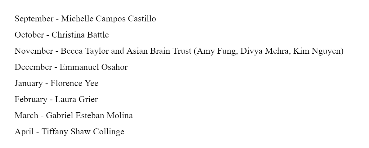 During the 2020/2021 speaker series, each artist touched on something different. We discussed strategies to support and protect one another in white art scenes/ ARC’s/other institutions, we unpacked readings as a group, we learned about each person’s art practices, and we swapped stories and talked astrology.